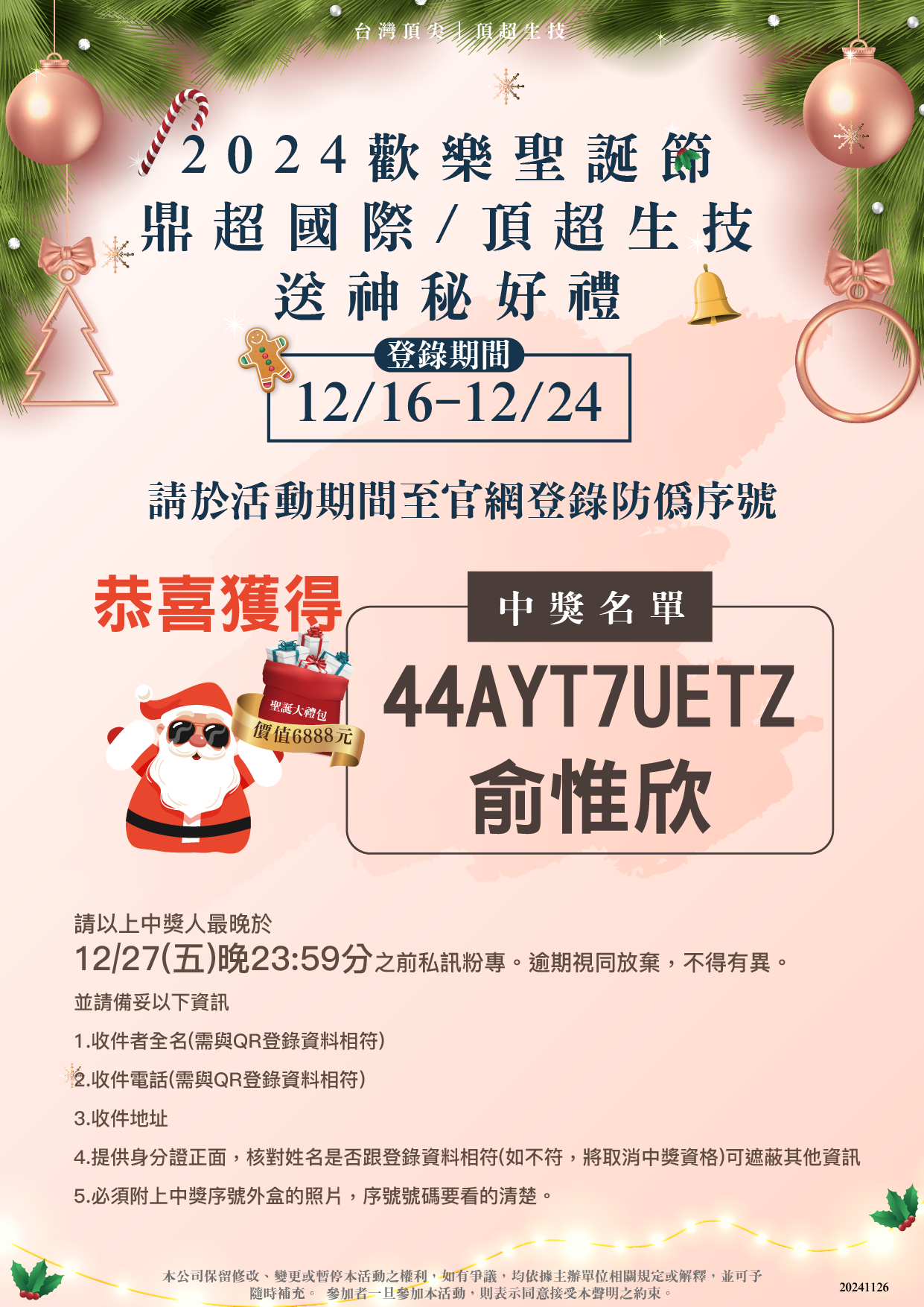 注意:公司方不會主動私訊得獎者,所有中獎資訊會公布在粉絲專頁後,由得獎者主動私訊公司官方粉絲團後,由公司提供相關領獎資料,若收到非公司官方私訊中獎,請提高警覺,與公司確認。
